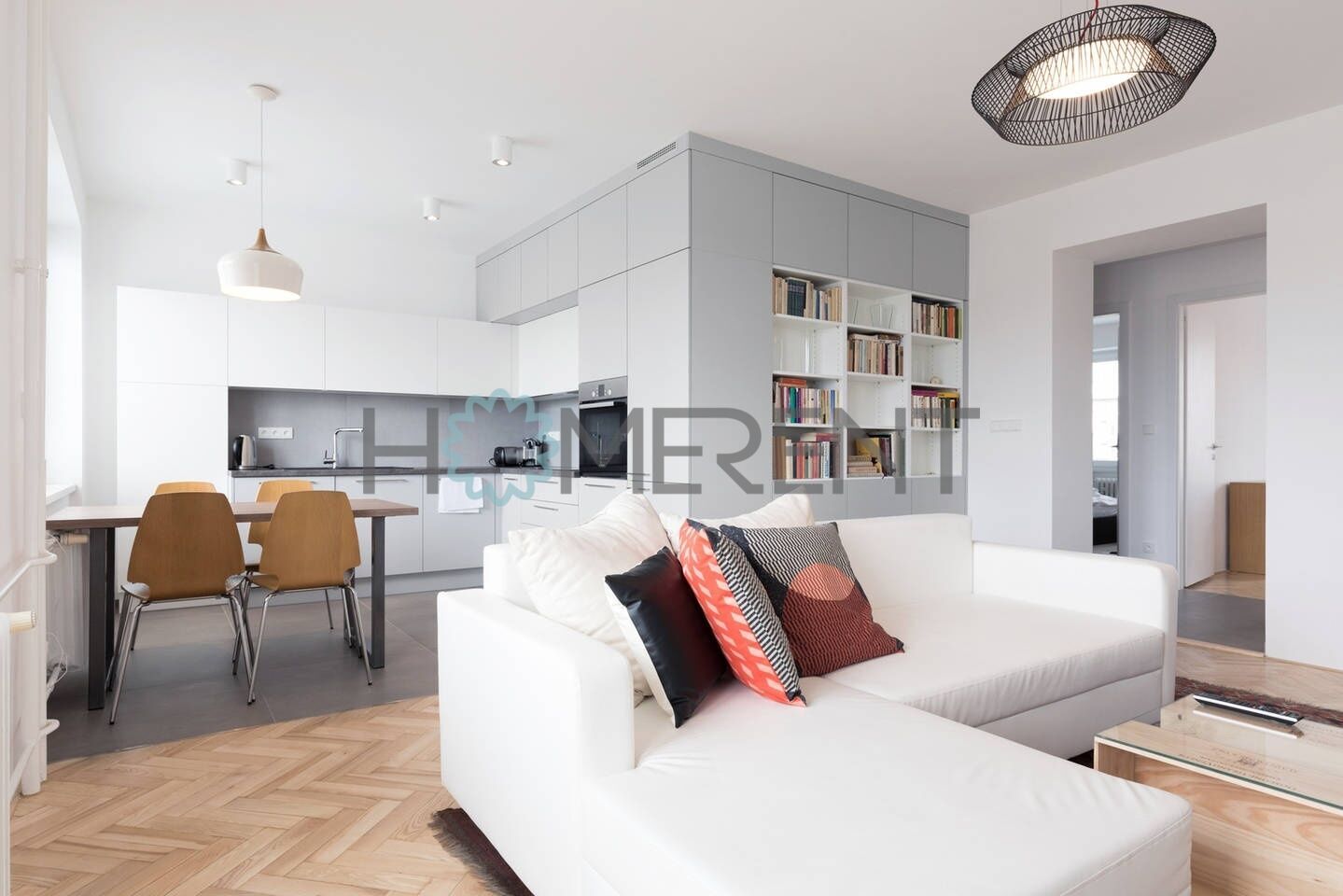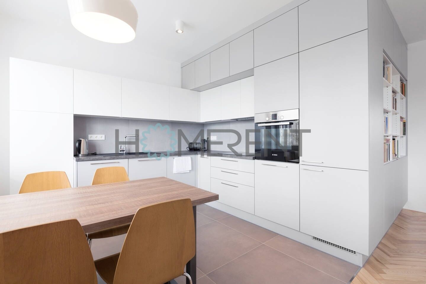 Interiér je zařízen moderním nábytkem, dominantou jsou krásné dřevěné podlahy, které dodávají bytu elegantní a nadčasový vzhled. Kuchyně je plně vybavena spotřebiči včetně lednice s mrazákem, myčky, trouby, varné desky, digestoře a kompletního nádobí.
