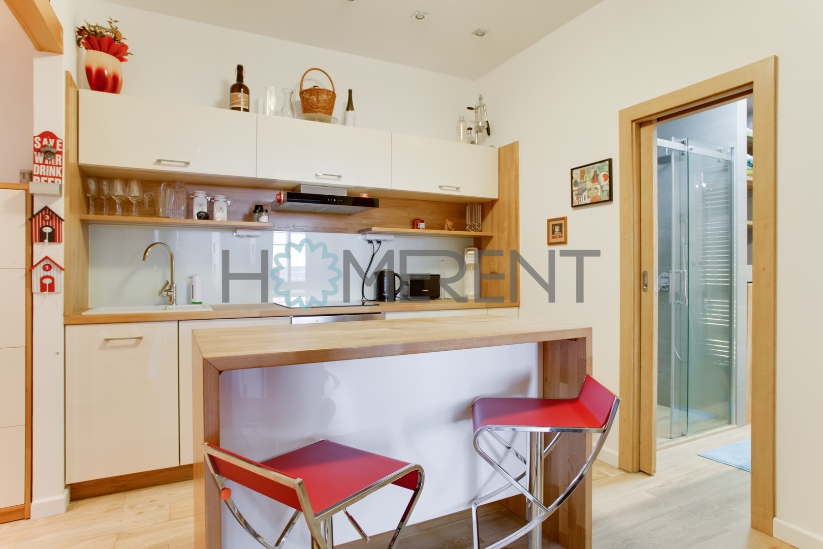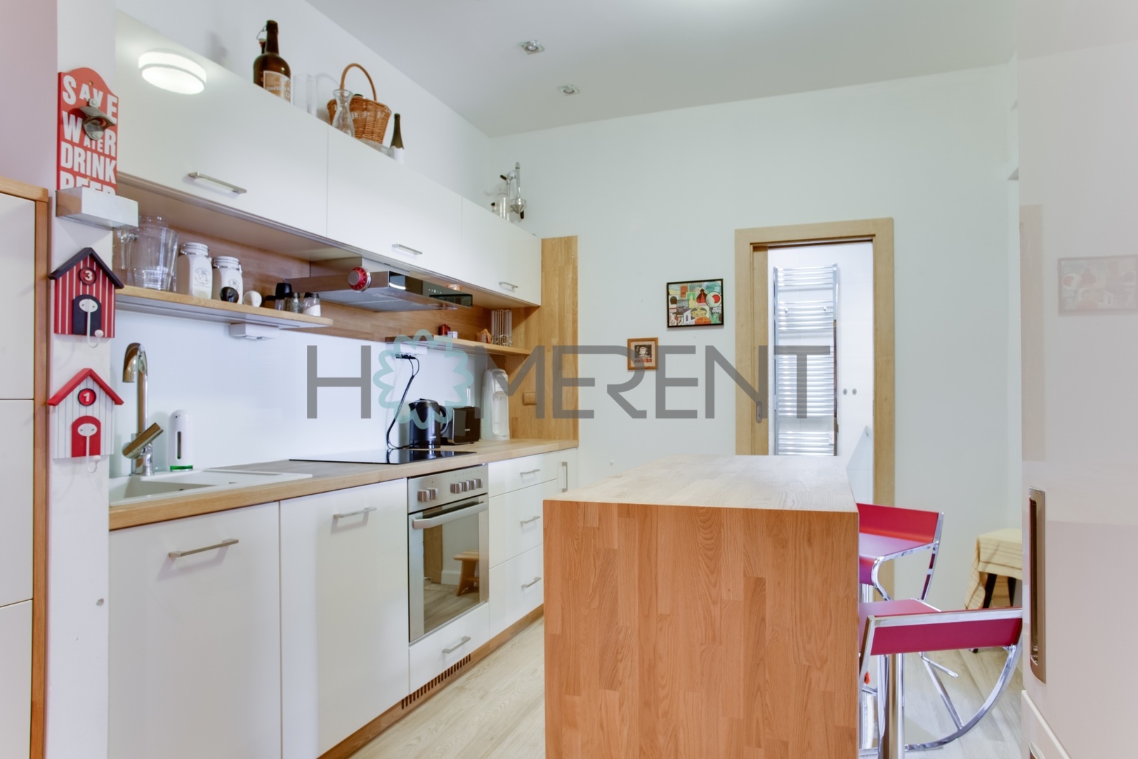 Byt je plně zařízený, útulný a příjemně prosvětlený. Kuchyň je kompletně vybavená a poskytuje dostatek prostoru nejen pro vaření, ale i pro každodenní stolování. Interiér působí velmi domácky a pohodlně, takže se zde nový nájemník může rychle cítit jako doma.