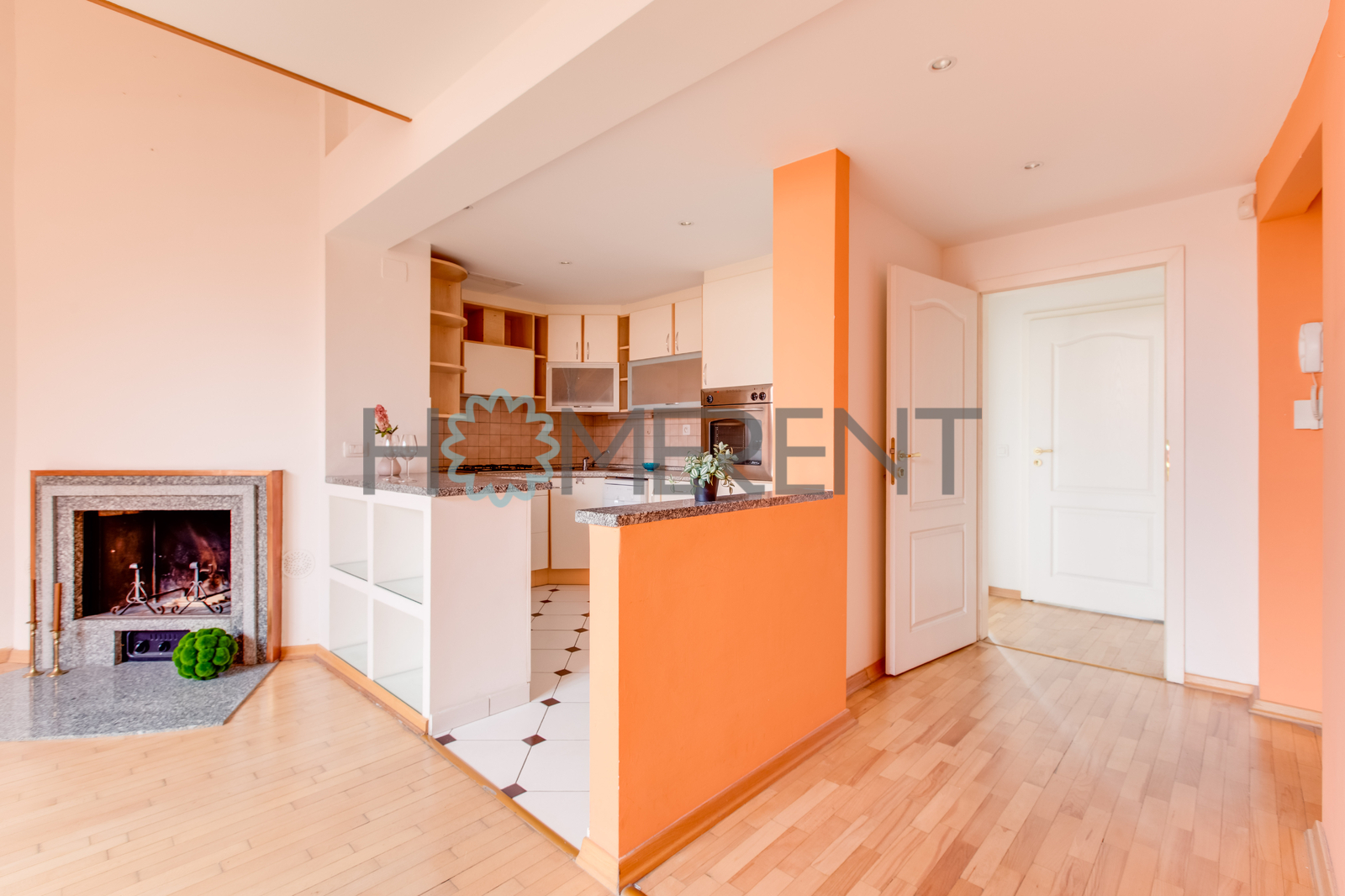 Dominantou bytu je velký otevřený obytný prostor s kuchyní, schodištěm, krbem a velkými okny, která zajišťují dostatek denního světla a dodávají interiéru vzdušnost a osobitý charakter. Prostor působí velmi příjemně, elegantně a zároveň útulně. Kuchyň je plně vybavená a připravená k okamžitému používání, takže poskytuje plnohodnotné zázemí pro každodenní život i příjemné posezení.